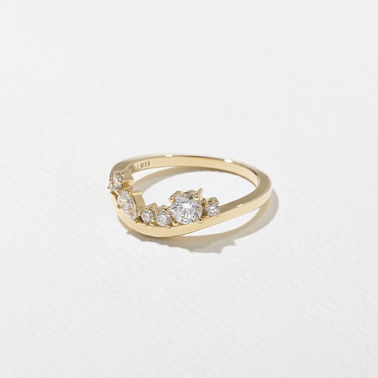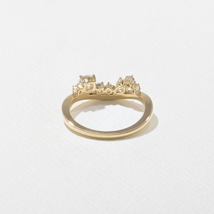 Bouquet is a beautifully complex band featuring a cluster of diamonds, inspired by the asymmetry of a perfectly kept flower garden. This swooping design nests beautifully with elongated ovals and emeralds, or with round diamond centers smaller than 2ct in size. She's also beautiful on her own.