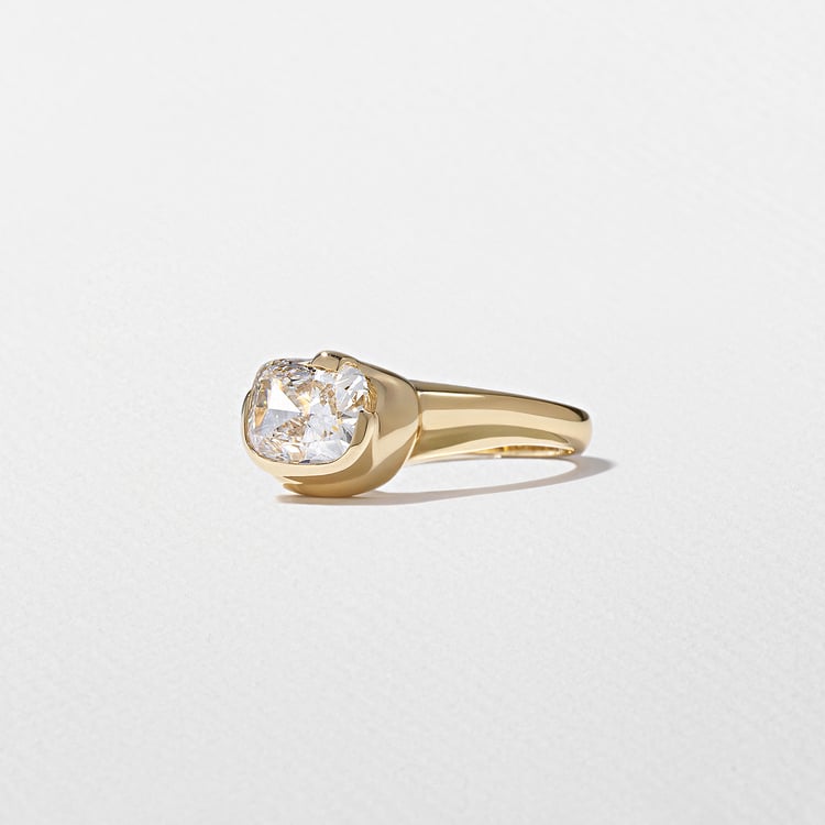 Gaia lives life like one beautiful, loving promise. With her effervescent cushion-cut center set east to west, Gaia hugs the finger like a warm embrace.