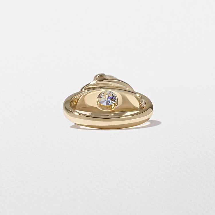 Gaia is a vision from all angles, with a halo of cushiony gold that hugs every facet of her brilliant round center.