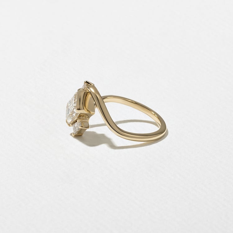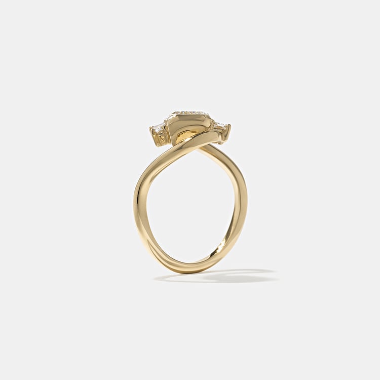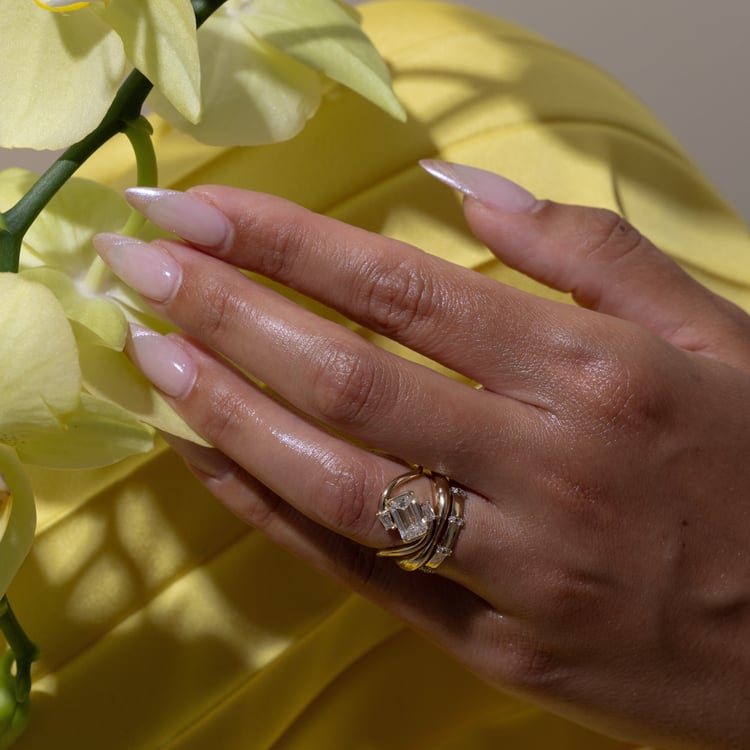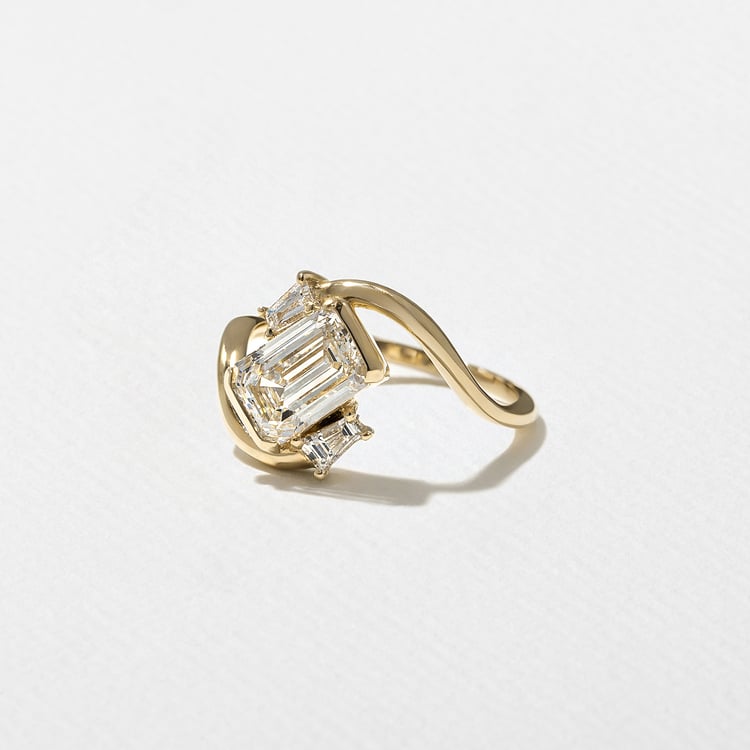 At her core, Gemma is torn between being a minimal maven and making every single guest at her wedding a custom cocktail. Be it extra or just right, any party that Gemma throws is one we’d like to be at. Her step-cut center shines wildly in between two tapered baguette diamonds that’ll make anyone look twice.