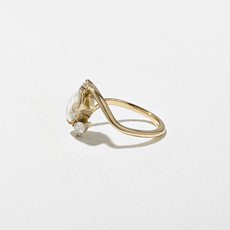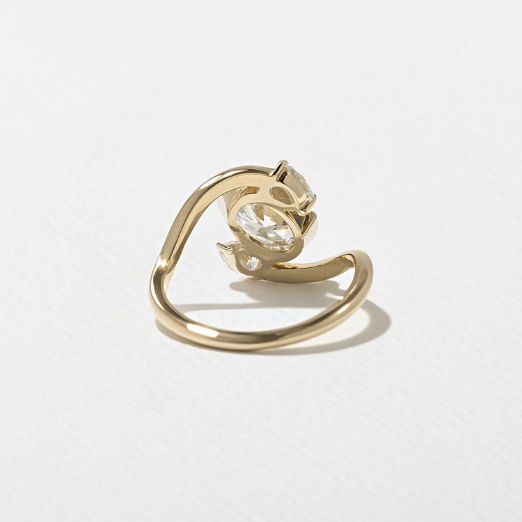 Gemma knows how to sparkle in the eye of the storm. When the going gets nuts, you can find her seeking solace at the MOMA, basking in her favorite James Turrell before dashing off to see her besties. Her oval diamond is set at a tantalizing angle, hugged delicately by two pear-cut stunners that wink as they catch the light.