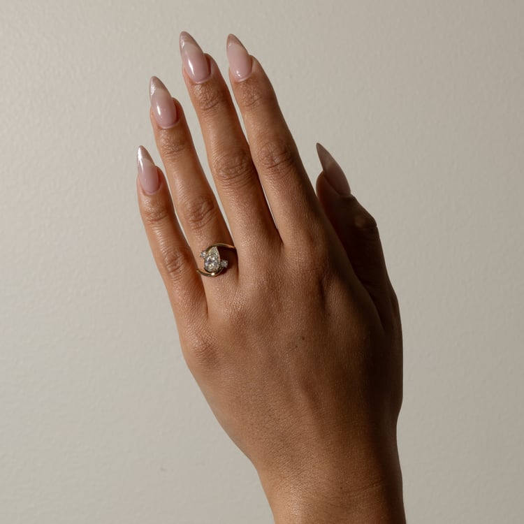 Shh—she’s coming down the aisle! And all we can say is wow. Holding the wildest of monotone bouquets and wearing a dress that makes you think, huh, could I make a bed sheet look that good?, Gemma's aesthetic is straight out of your chicest fever dream. Her pear-cut center twinkles coyly in between two round accent diamonds that give it just enough punch.
