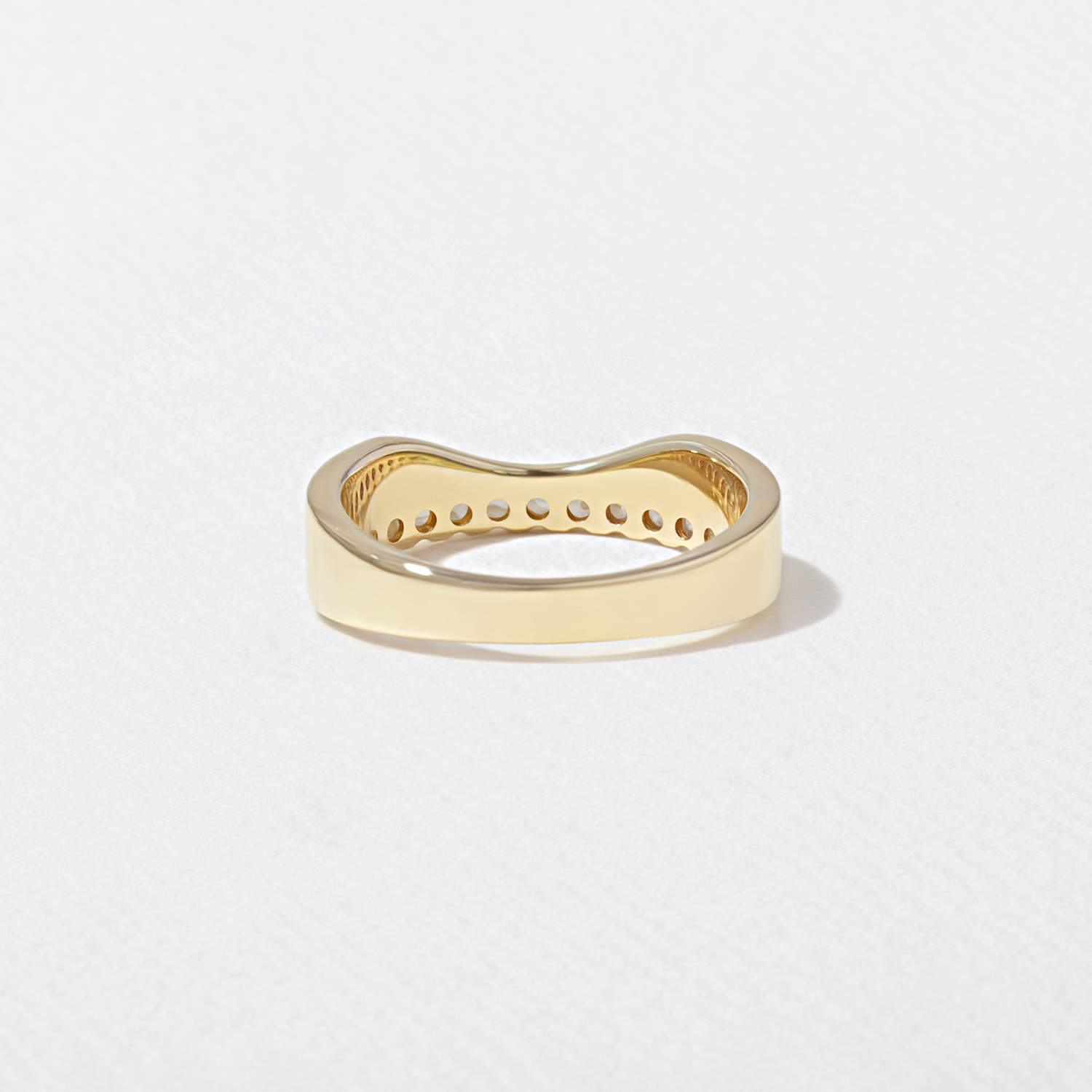 With its notched design and dazzling row of diamonds, Glacier is the perfect pairing for any engagement ring. Shown here in 14k yellow gold. Lab-grown round brililant diamonds are F/VS+ quality, 0.78tcw. Band measures approximately 4.5mm at its widest.