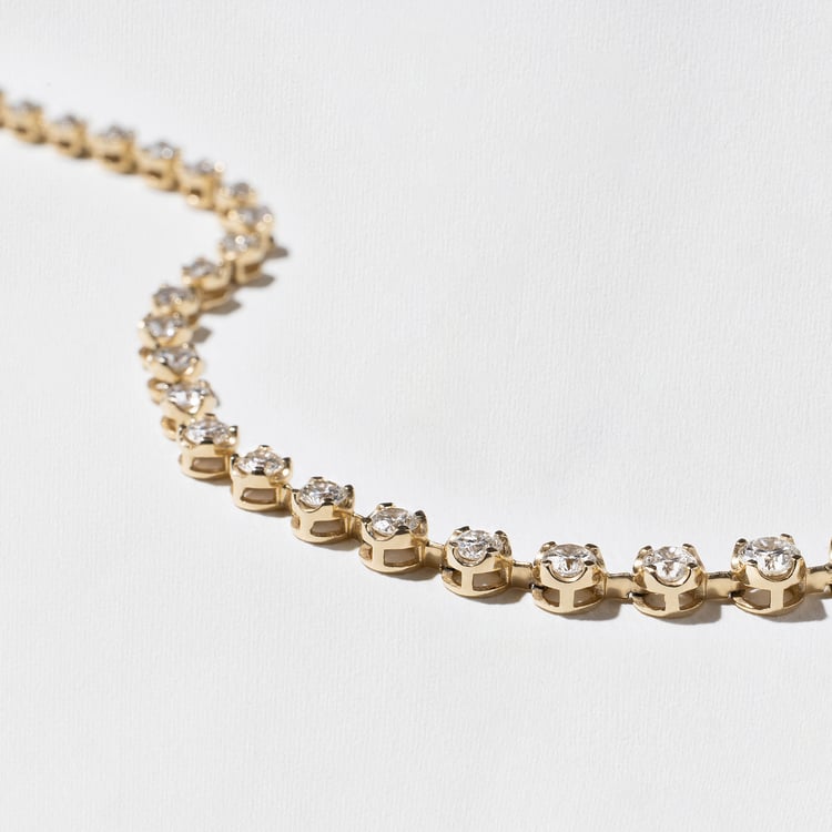 Set with approximately 6.75ctw lab-grown round brilliant-cut diamonds. Measures 16” in length and set in 14 karat gold.