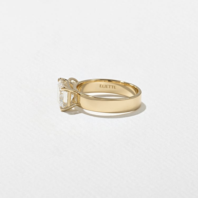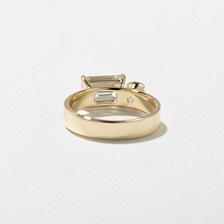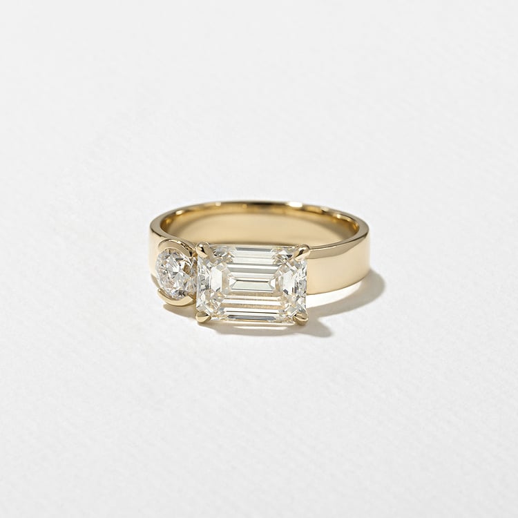 Shown here with an approximately 2.20ct G/H color, VS+ lab-grown emerald cut diamond and a 0.35ct G/H color, VS+ lab-grown round diamond. Band measures 4mm wide.