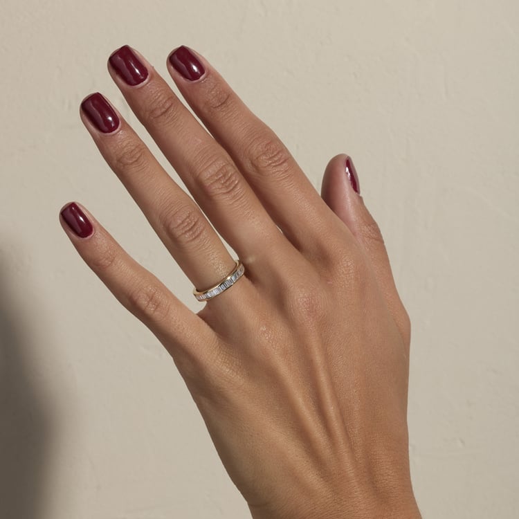 Lark is a straight band that’s adorned with vertically-set baguette diamonds. Bold and modern, it creates a striking stack with any engagement ring.