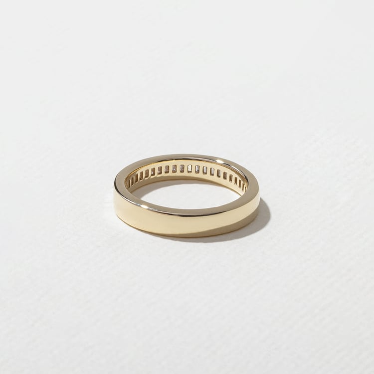 Shown here in 14k yellow gold and lab-grown white baguette diamonds, 0.75ctw. Band measures 4.0mm wide. Stacked with an Eve Oval with Tapered Baguettes Ring and the Acacia gold cuff band.