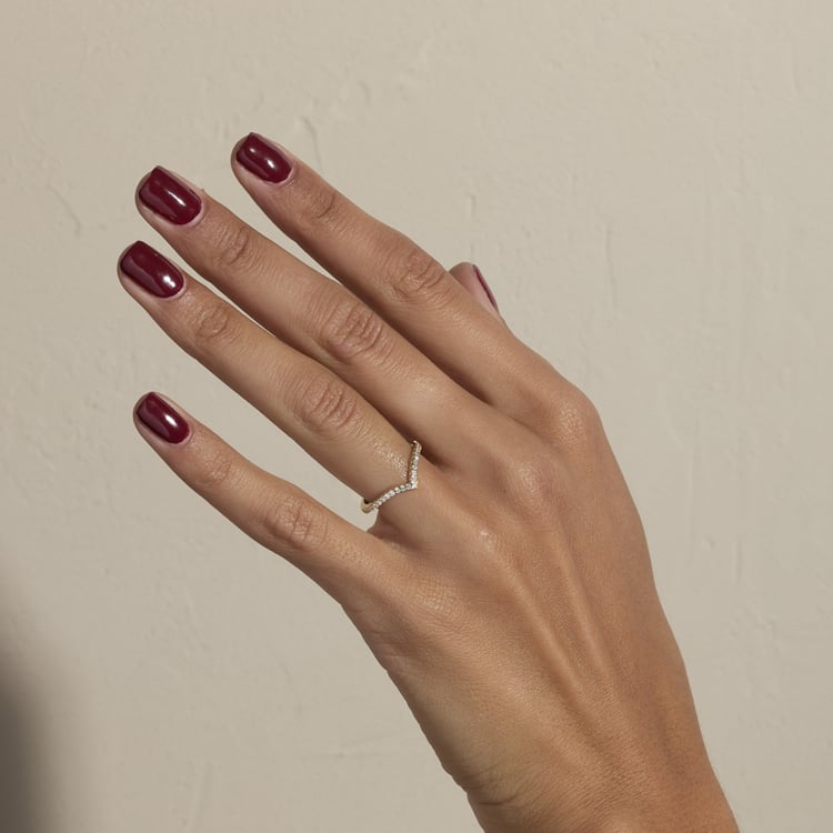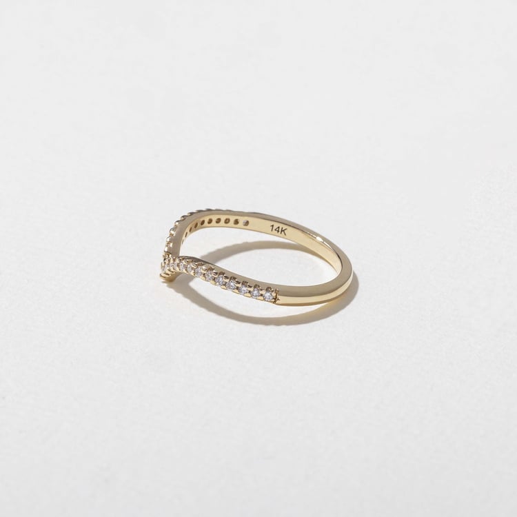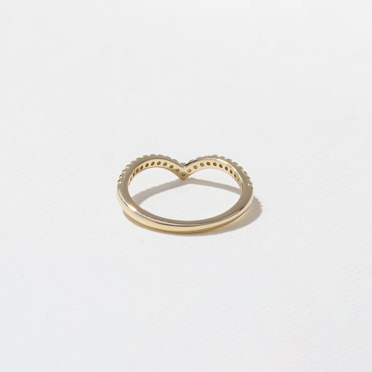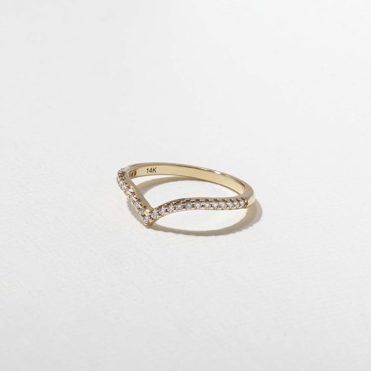 Luna is pavé diamond-lined chevron band that nestles in next to the engagement ring, nice and cozy. The chevron shape draws your eyes directly to the center stone like a curtain rising on stage.