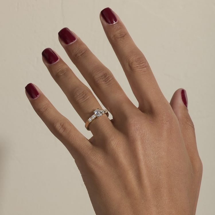 Set with an approximately 0.50ct G/H color, VS+ lab-grown emerald cut diamond and lab-grown princess and round accent diamonds, 0.30ctw. Band measures 2.70mm wide.