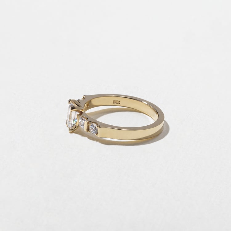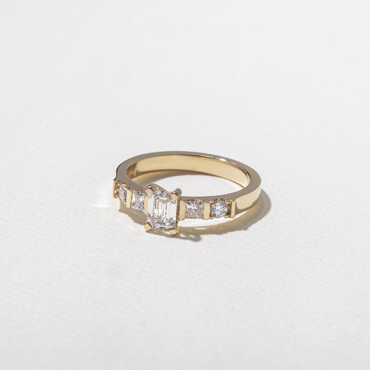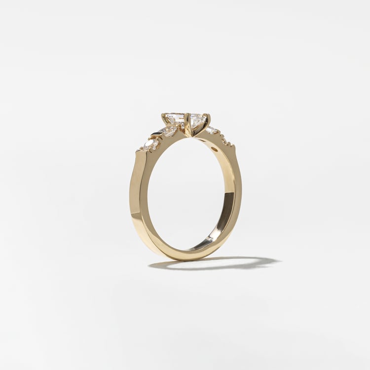 Mona keeps a low profile, which is why you couldn’t even find her on LinkedIn. She’s understated but sumptuous, an art deco emerald-cut stunner with no shortage of sparkle. She packs a punch with four round and princess-cut diamonds that create a glittering, glass brick effect. Set closer to the finger than blingy solitaires, she’s the one at the party who draws you in with her soft voice and keeps you riveted with sizzling conversation.