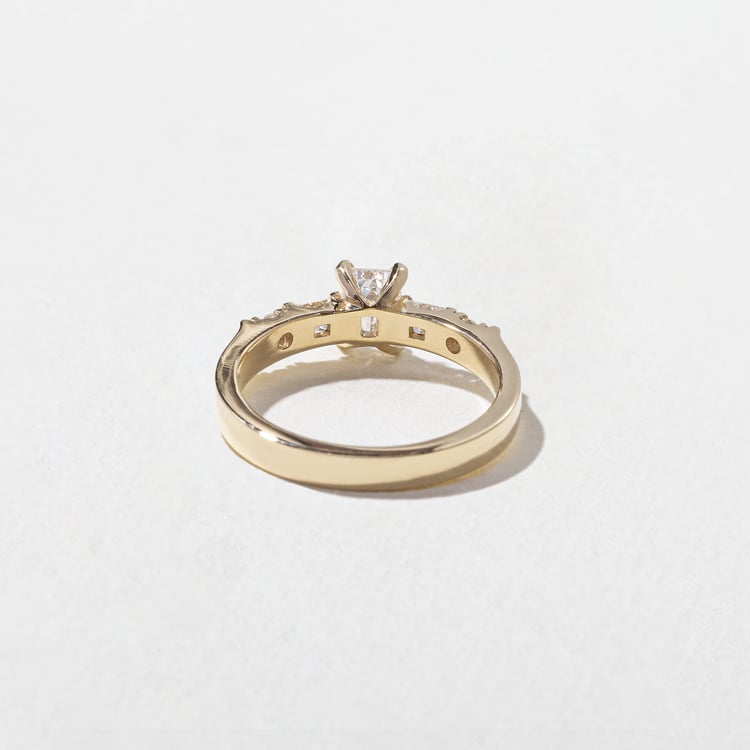 Set with an approximately 0.50ct G/H color, VS+ lab-grown emerald cut diamond and lab-grown princess and round accent diamonds, 0.30ctw. Band measures 2.70mm wide.