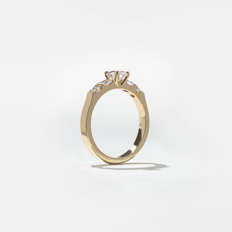 Untraditional and unapologetic, Mona doesn’t take the road less-traveled—she’s flying out of here on a hot air balloon. She’s into this low-profile, art deco setting because it sits close to the finger, unlike high-profile solitaires that (to Mona) scream “I’m an engagement ring!” Always a fan of mixing patterns and prints, Mona’s side diamonds alternate round and princess-cut, and all that sparkle is nearly blinding. As dazzling as a disco ball, as demure as a duchess, Mona makes her move.