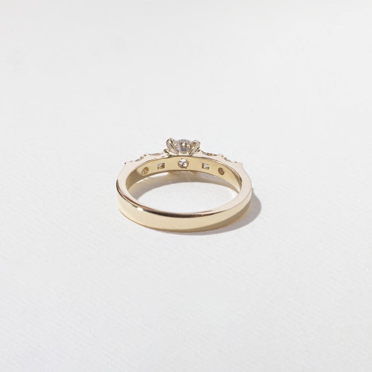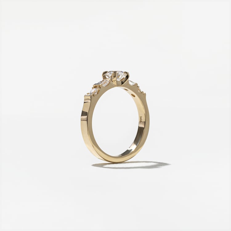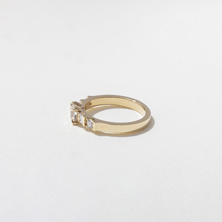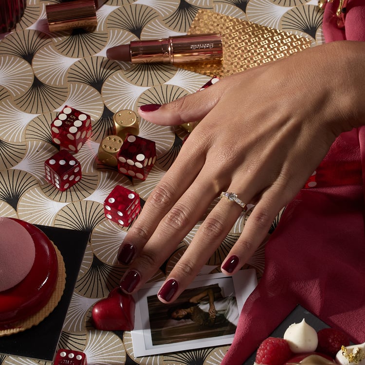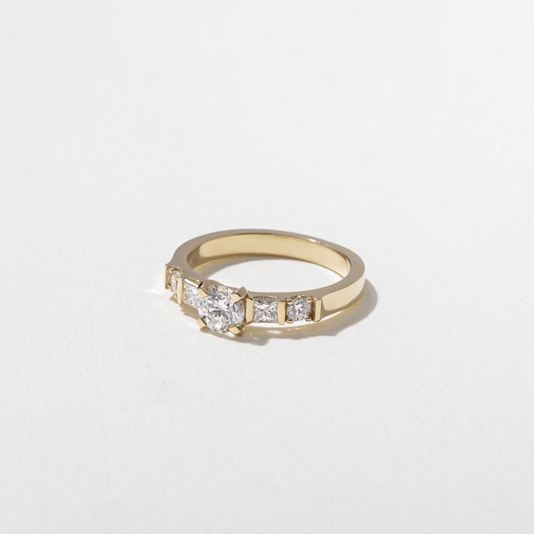 Velvet, vintage wallpaper, musty British libraries—Mona’s here for all of it. She’s a glamorous old soul who prefers to keep a low profile, which is why her stones are set closer to the finger than other high-set rings, which Mona considers a little too show-offy for her tastes. It’s a subtle detail that creates an intimate effect. Both round and princess-cut stones bring all of the sparkle necessary in life (a lot). At the center: a classic round diamond that could stop traffic.