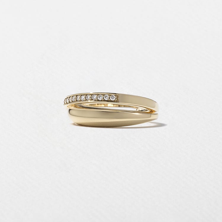 A belt of diamonds cuts across a swell of gleaming gold, creating a surprisingly versatile statement that can stand on its own or pair perfectly with an engagement ring.