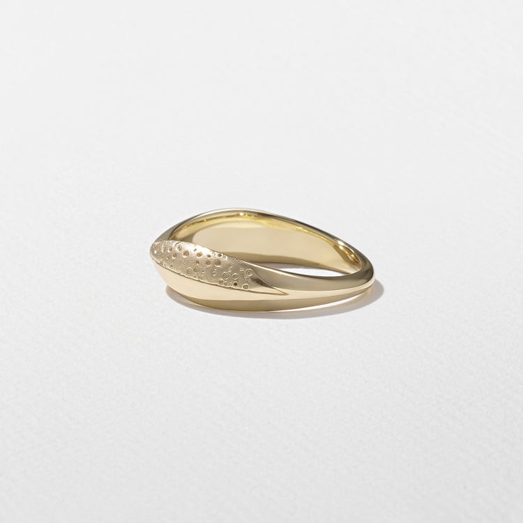 A bubbly band with a unique matte finish, the textured Sonora brings an earthy touch to any stack. Shown in 14k yellow gold. Measures 5.5mm at its widest point.