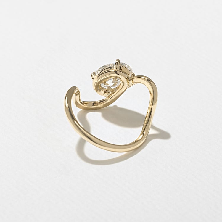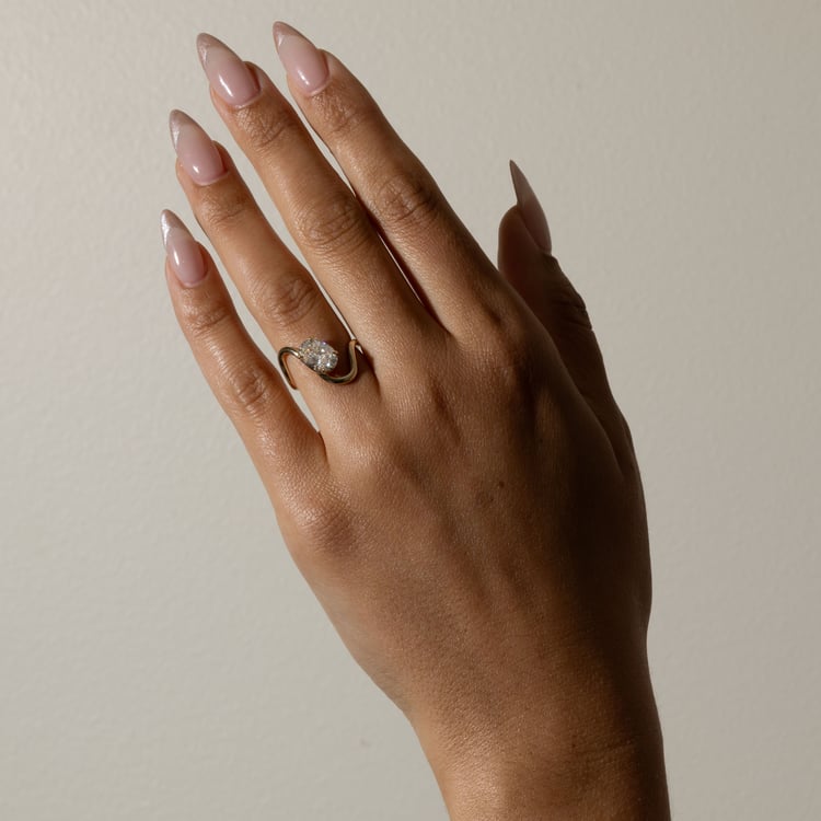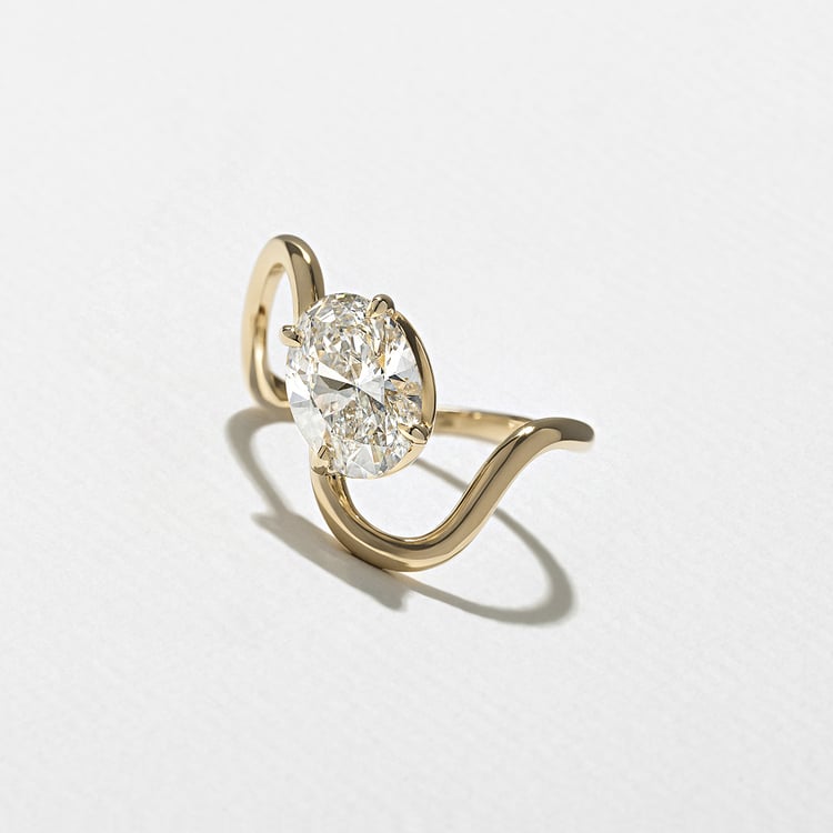 Stella is the quintessential pixie dream girl, effortlessly captivating everyone she meets. With a passion for the arts and a heart of gold, it's no surprise her MoMA wedding was standing room only. She flaunts an oval diamond on a swooping gold band—a solitaire that's strikingly unique.