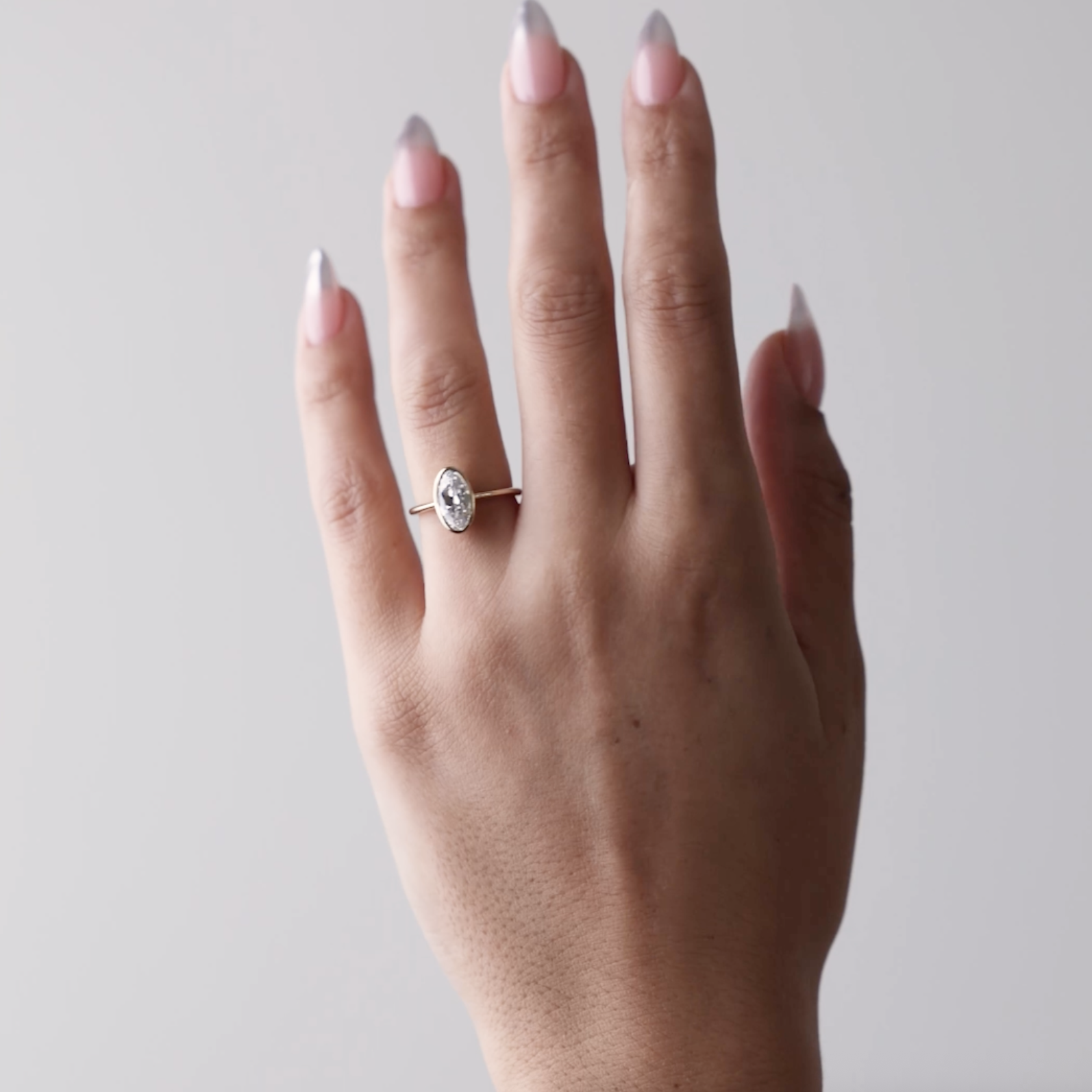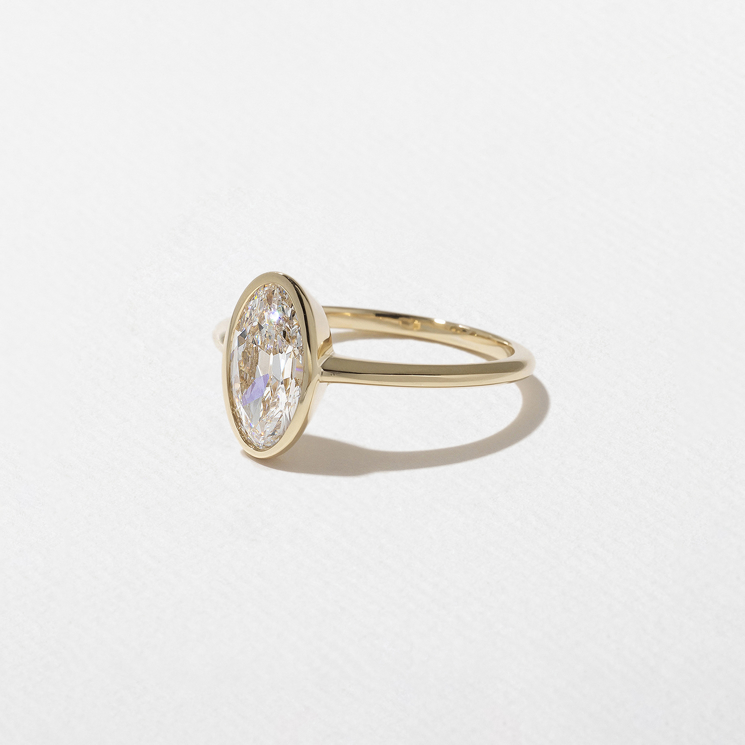 Bailey is a city girl with old world sensibilities—she navigates a concrete jungle by day and a softly burning wood fire by night. Her golden bezel cradles an antique-style oval-cut diamond with chunky facets that will set any heart aglow.