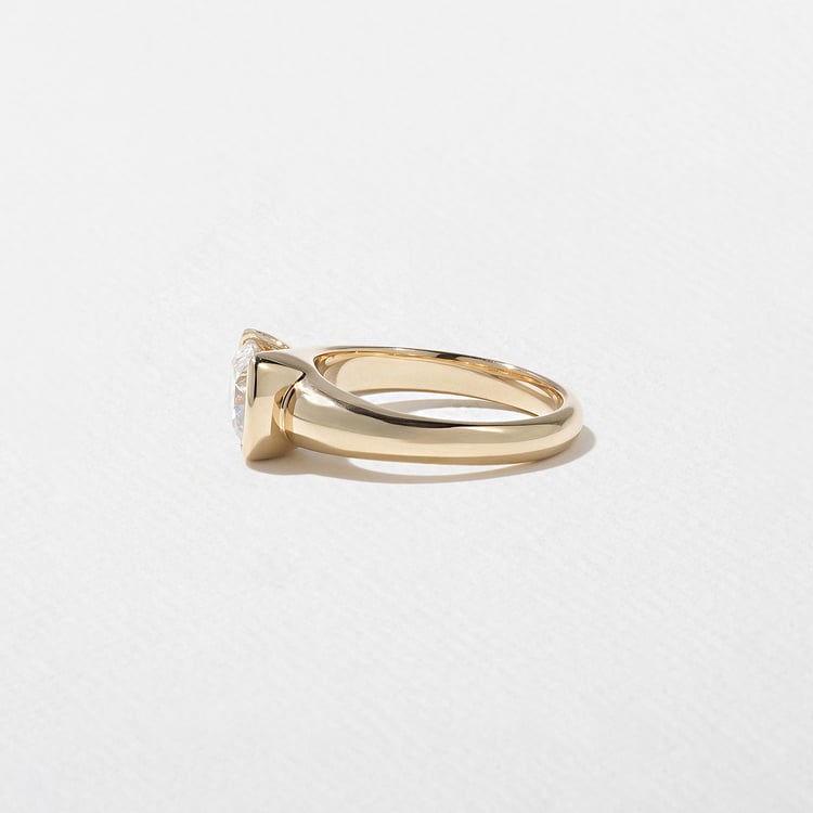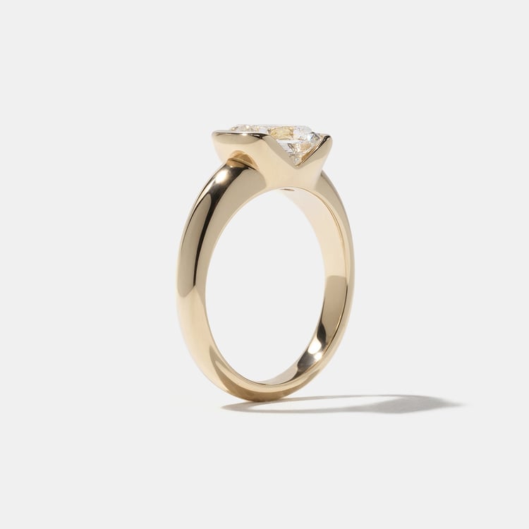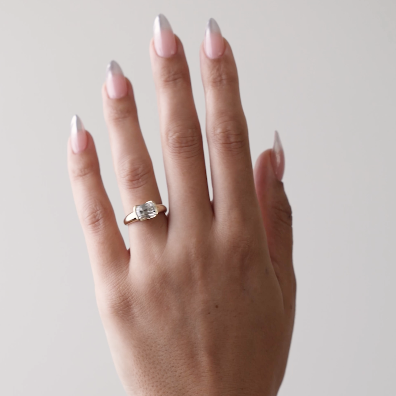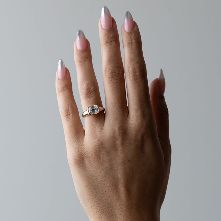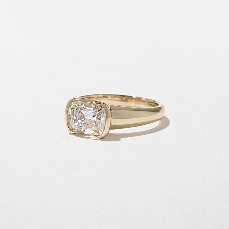 In a world where fashion moves fast and new fads fly, Esme stands on a path all her own. She’s always been an old soul—the kind we need more of these days. Her half-bezel setting is drenched in metal, framing an antique style cushion-cut diamond in a way that highlights every one of those juicy facets.