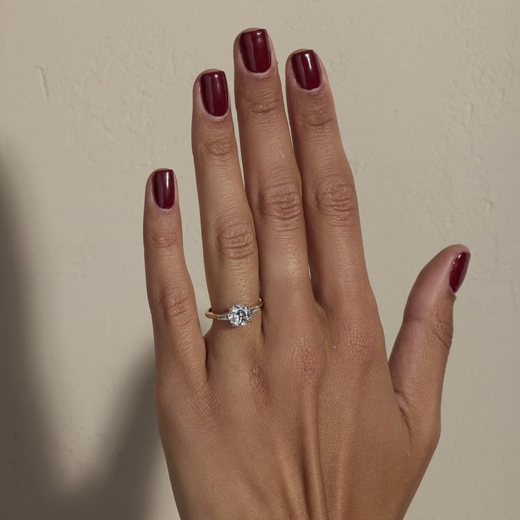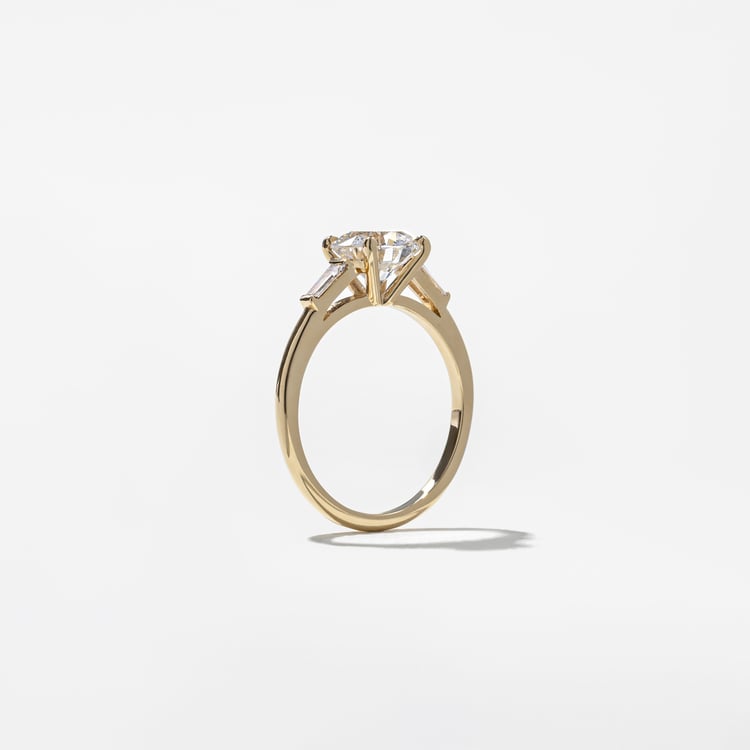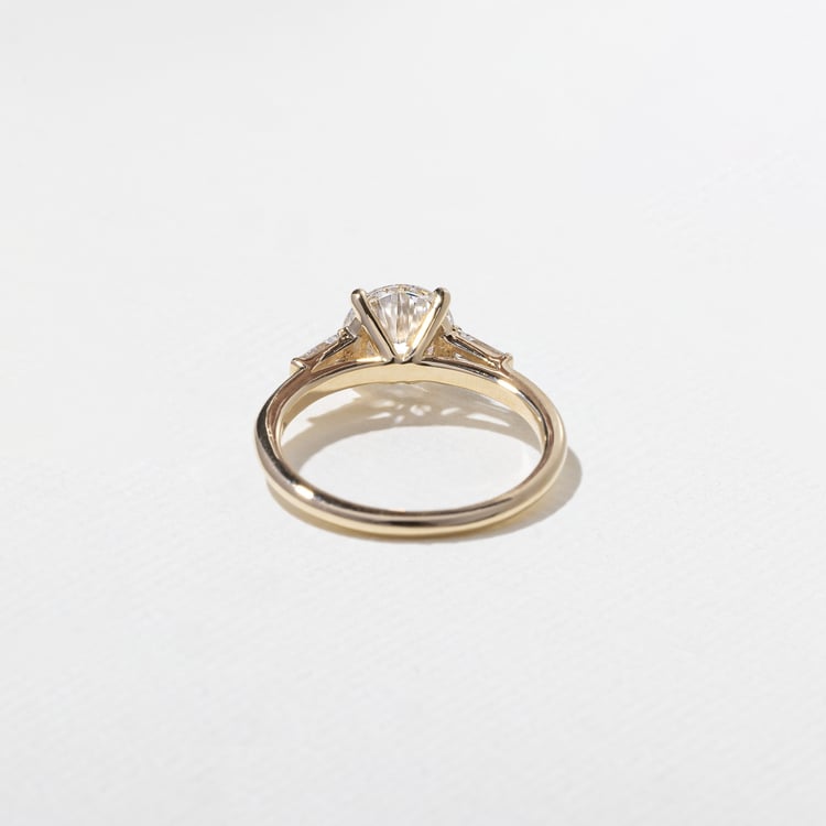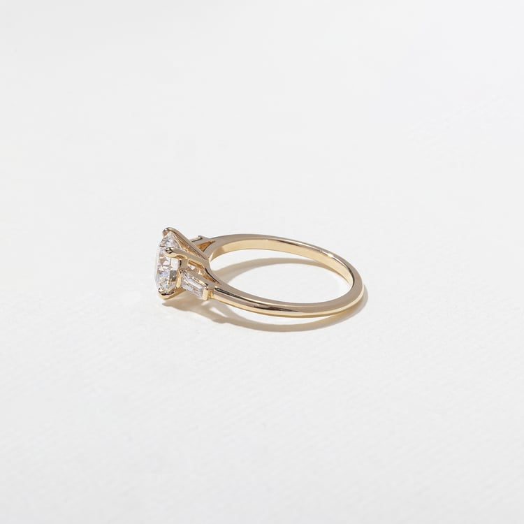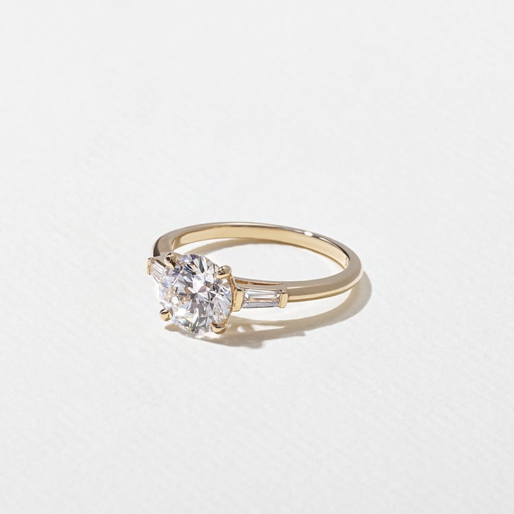Shown with a 1.53ct G/VVS2 lab-grown round diamond and 0.20ctw lab-grown tapered baguette diamonds.