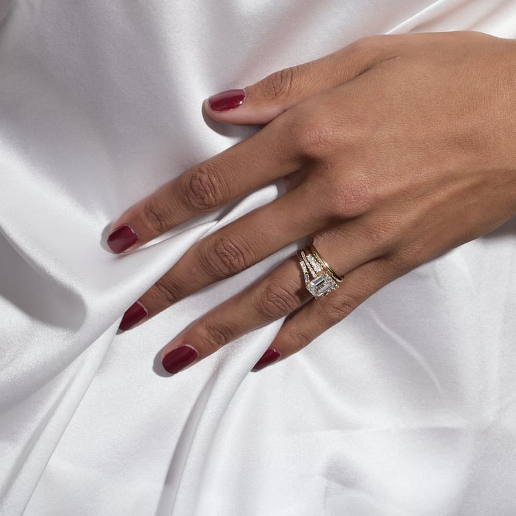 Your Iris can be set with an Emerald-Cut diamond between 0.90ct and 6.0ct. Not sure what size is right for you? Select your diamond and order a resin print of your ring to try on at home.