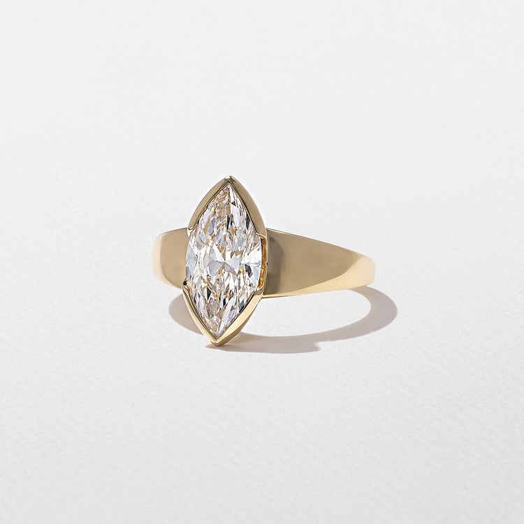 Meet the ring that lingers in your memory long after first glance. A sleek half-bezel gently hugs the marquise center stone, its pointed silhouette drawing the eye with timeless elegance. The setting melts into a bold, tapered band that balances strength and softness, making a quiet yet confident statement on the hand. Shown here in 14k yellow gold with a 2.06ct E/VVS2 lab-grown marquise diamond, stacked with a Twist with Pave band. Your Lou can be set with an oval diamond between 0.90ct and 6.0ct. Not sure what size is right for you? Select your diamond and order a resin print of your ring to try on at home.
