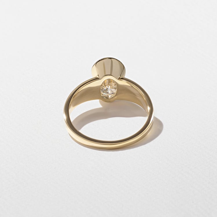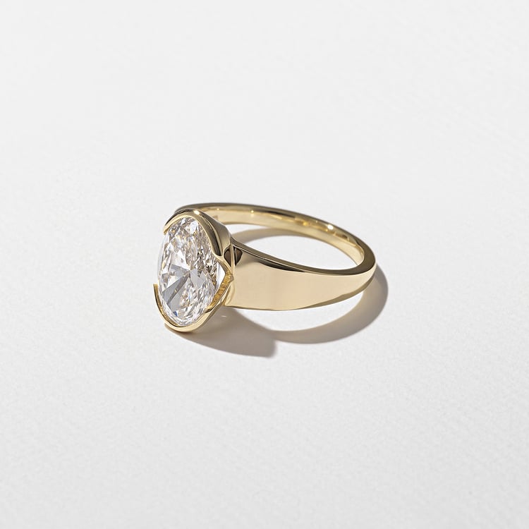 Try as you may, you’ll never forget this ring once you lay eyes on her. Lou’s half-bezel cradles its center oval just enough, flowing straight into a wide tapered band that feels simultaneously bold yet delicate around the finger.