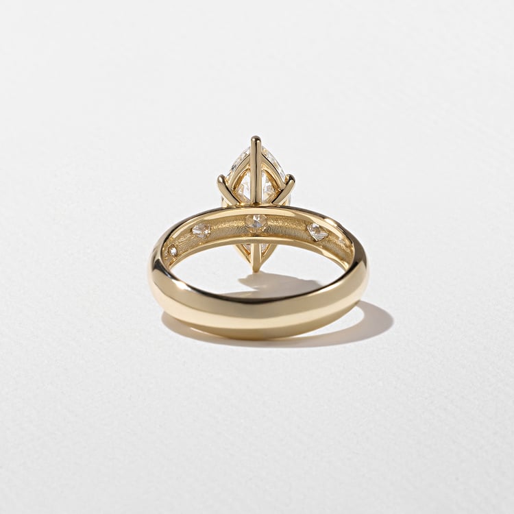 They say love is written in the stars, and Skylar takes that to heart. Her center marquise diamond shines bright like a north star, flanked by a playful mix of sparkle. Shown here in 14k yellow gold with a 2.09ct G/VVS2 lab-grown marquise-cut diamond. Band measures 4.1mm wide.