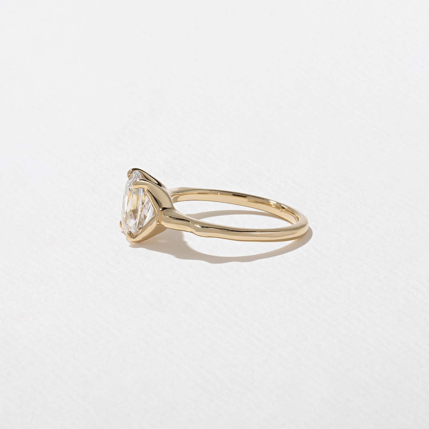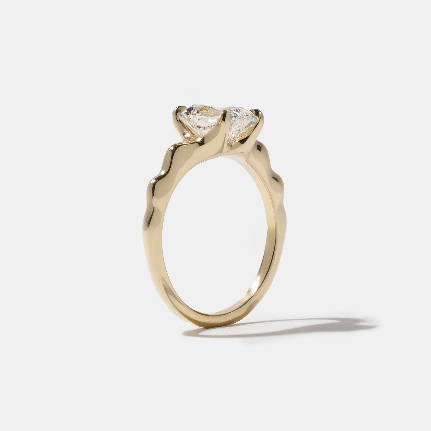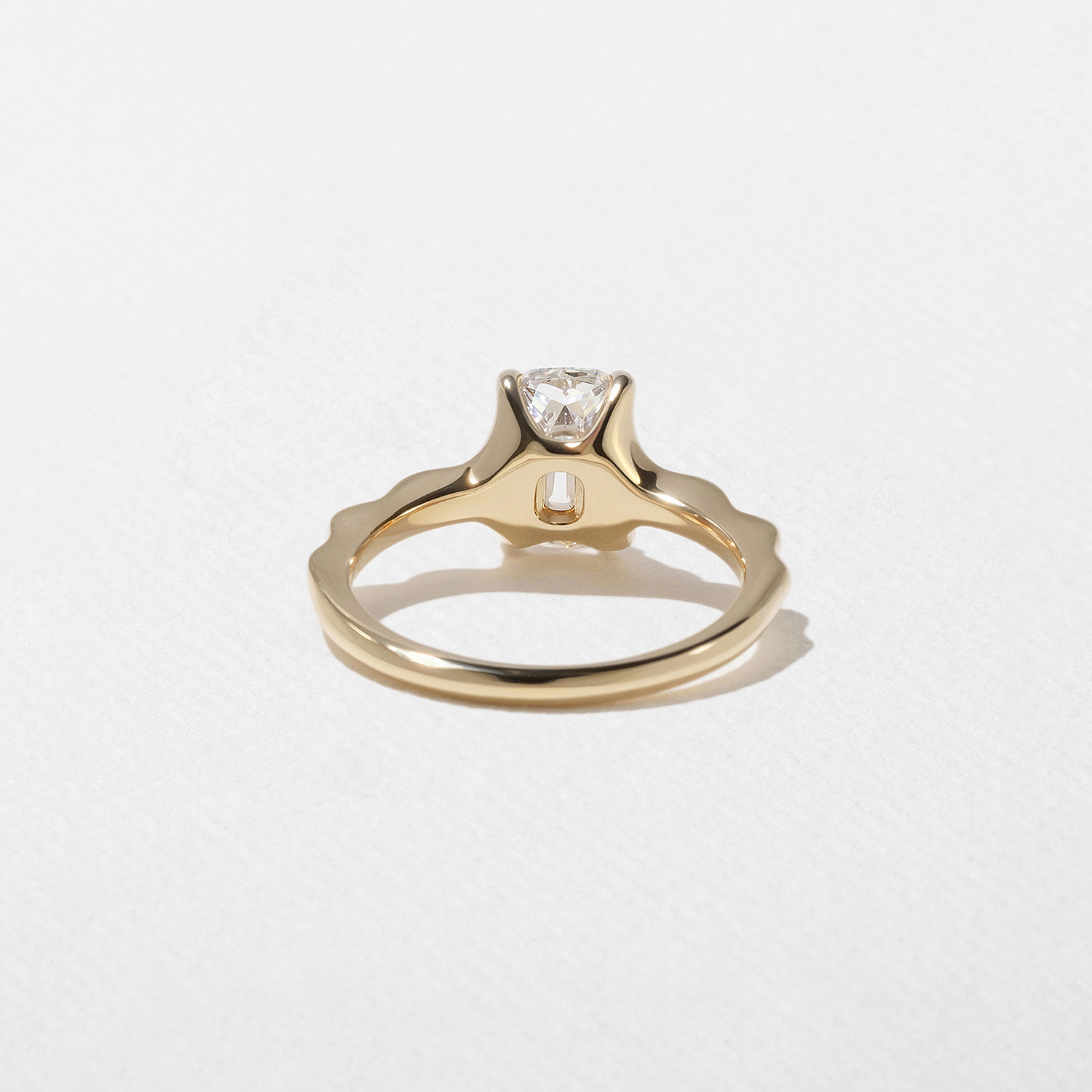For Sloan, life is all about the ups and downs. And when things are up, you can bet she knows how to celebrate. Tidy from the top with high drama from the side, Sloan is always ready to surprise you. And despite her unique wavy band her center-diamond is as classic as can be, featuring an antique-style cushion-cut diamond that shimmers in the light. Shown here with an approximately 1.59ct F/VS1 antique-style cushion-cut diamond. Your Sloan can be set with a antique style cushion-cut diamond between 0.90ct and 6.0ct. Not sure what size is right for you? Select your diamond and order a resin print of your ring to try on at home.