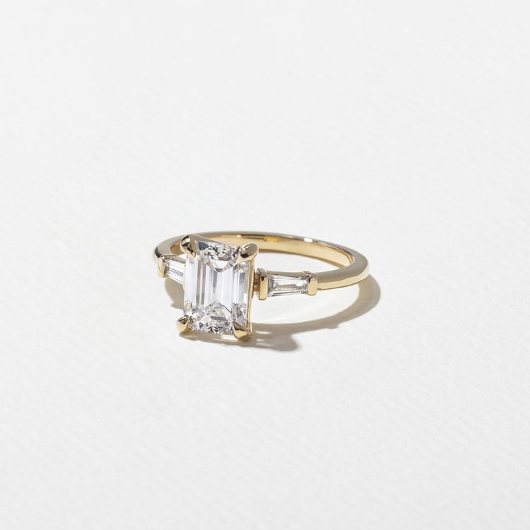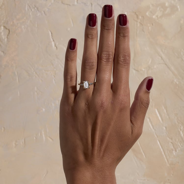 Shown with a 1.56ct F/VS2 lab-grown emerald cut diamond and 0.20ctw lab-grown tapered baguette diamonds.