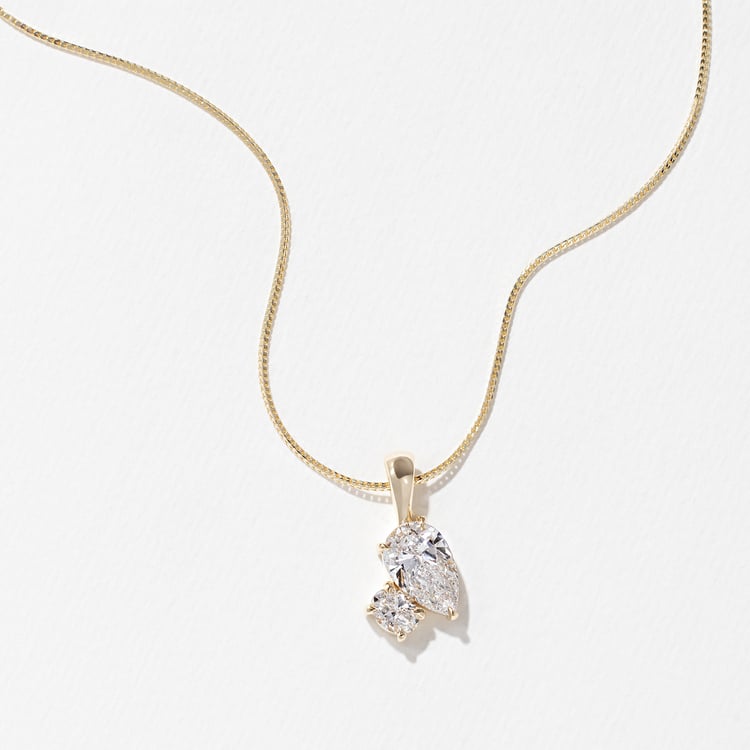 Pendant measures approximately 11mm by 9mm. Set with an approximately 1.45ct H/VS+ lab-grown oval diamond on a 14k gold 16” chain.
