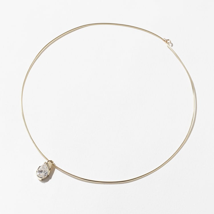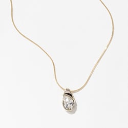 Pendant measures approximately 15mm by 8mm. Set with an approximately 1.60ct H/VS+ lab-grown pear-cut diamond on a 14k gold franco 18” chain.